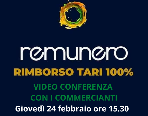 Si informano tutti i commercianti del territorio, di ogni ordine e settore, che nella giornata di giovedì 24 febbraio alle ore 15.30, si terrà una video conferenza con i tecnici REMUNERO.