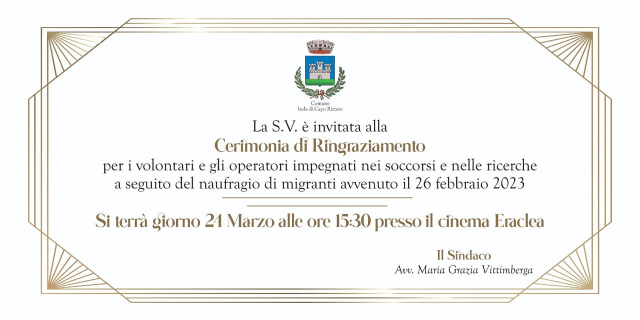 Tutto pronto per il grande evento di domani pomeriggio che vedrà l'arrivo a Isola Capo Rizzuto di tutte le associazioni di Volontariato che hanno preso parte alle fase di soccorso e recupero corpi in mare in seguito al tragico evento del 26 febbraio.