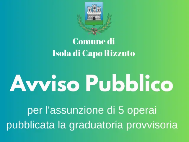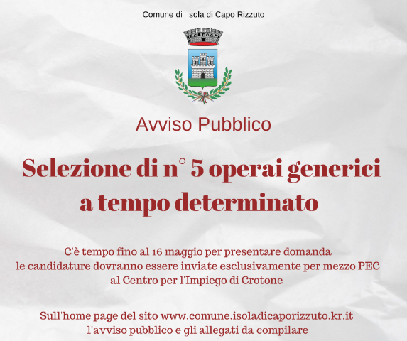 Comune di Isola, avviso pubblico per cinque operai: c’è tempo fino al 16 maggio