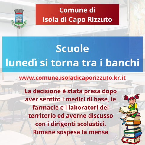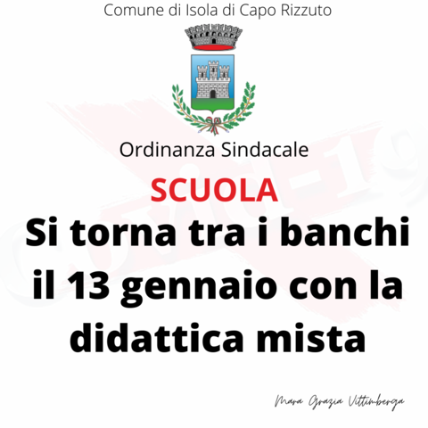 il Sindaco Maria Grazia Vittimberga, in accordo con l’Assessore delegato Carlo Cassano e la Giunta Comunale, ha confermato il ritorno tra a scuola per lunedì 17 gennaio.