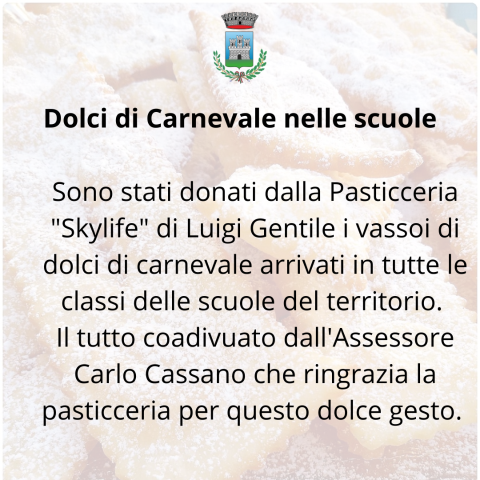 Sono stati donati dalla Pasticceria "Skylife" di Luigi Gentile i vassoi di dolci di carnevale arrivati in tutte le classi delle scuole del territorio.