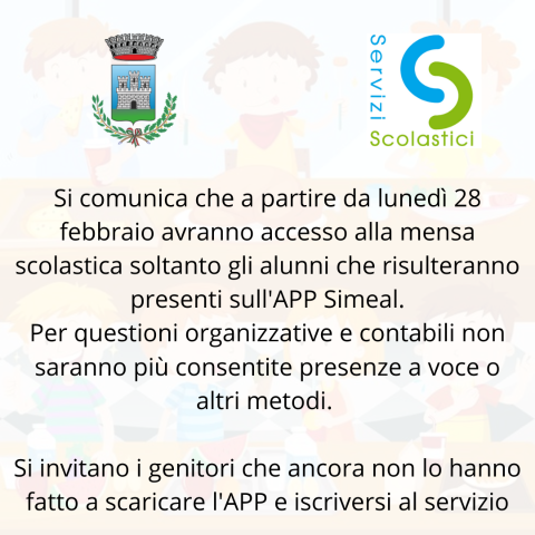 Si comunica che a partire da lunedì 28 febbraio avranno accesso alla mensa scolastica soltanto gli alunni che risulteranno presenti sull'APP Simeal.
