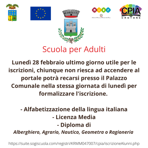 Ultimi giorni d’iscrizioni per la scuola degli adulti che a settembre prenderà il via sul territorio di Isola di Capo Rizzuto.