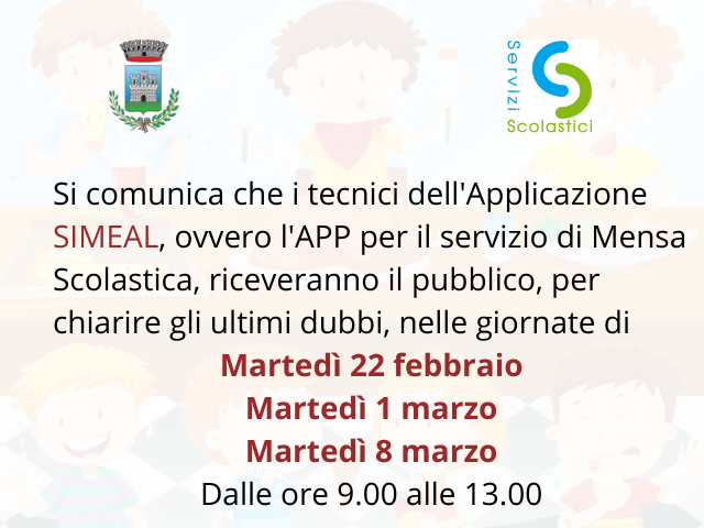Si comunica che i tecnici dell'Applicazione SIMEAL, ovvero l'APP per il servizio di Mensa Scolastica, riceveranno il pubblico, per chiarire gli ultimi dubbi, nelle giornate di Martedì 22 febbraio Martedì 1 marzo Martedì 8 marzo Dalle ore 9.00 alle 13.