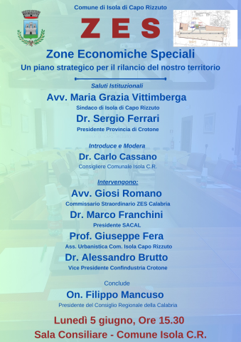 La presente per invitarla al convengo in oggetto necessario per discutere le Zone Economiche Speciali, del territorio, che, nel caso di Isola di Capo Rizzuto, riguardano l’area dell’Aeroporto Sant’Anna.